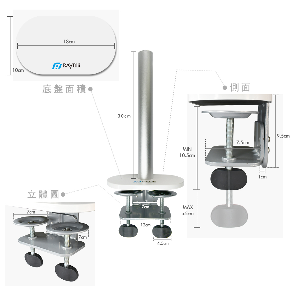 6. 兩用底座設計(穿孔、夾式),最高可夾7cm厚度桌面,穿孔孔距需大於7cm