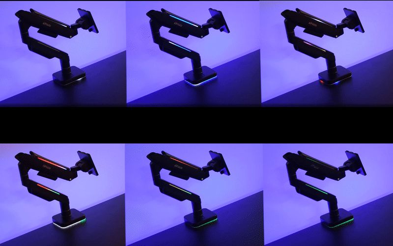 7. 啟發於專業RGB電競光效的設計理念,於支臂與底座內嵌RGB LED發光元件,打造與環境一體的沉浸式遊戲氛圍效果