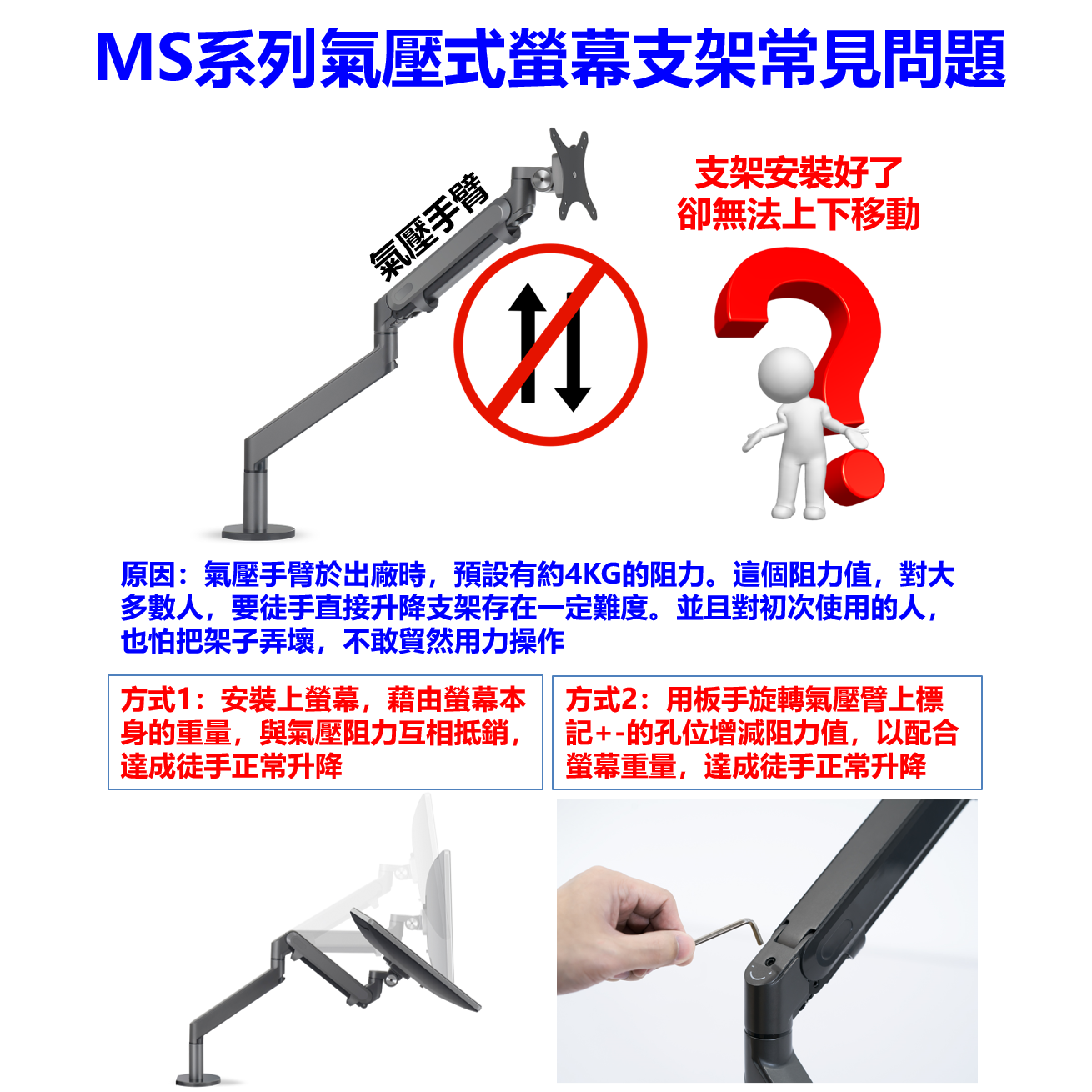 註:氣壓臂出廠預設值為4KG,請依照螢幕重量自行調整氣壓臂扭力