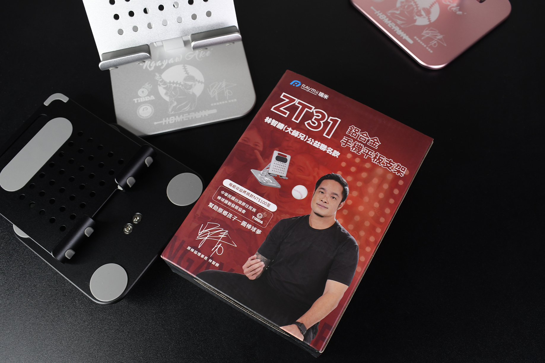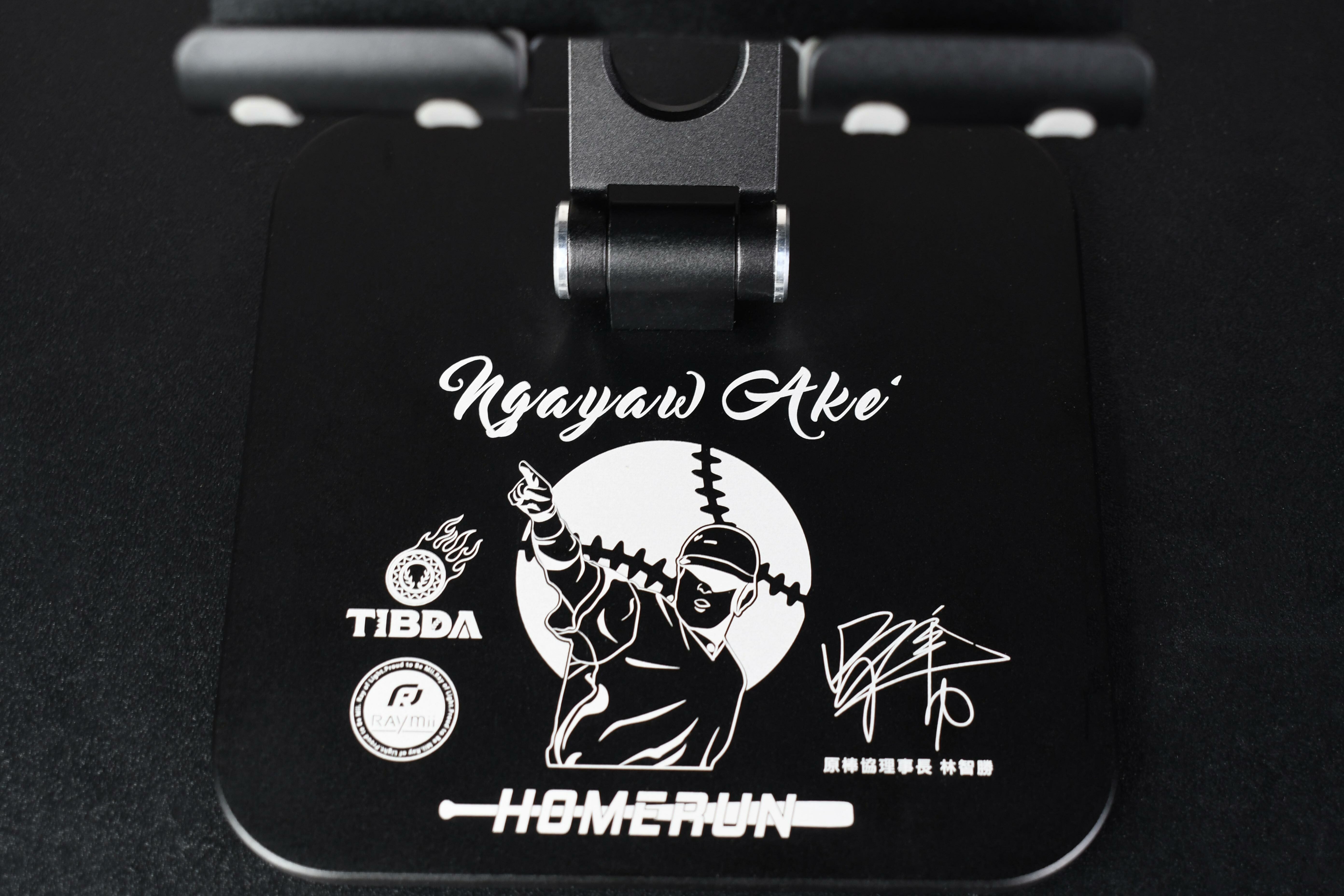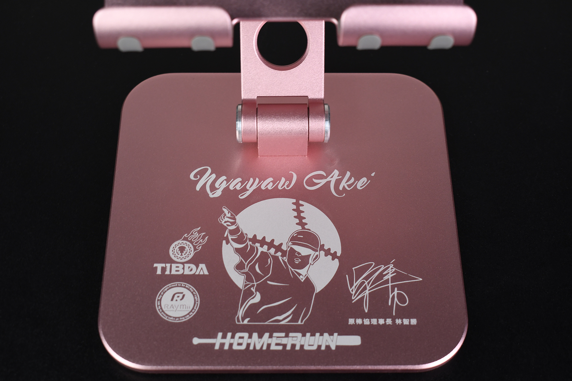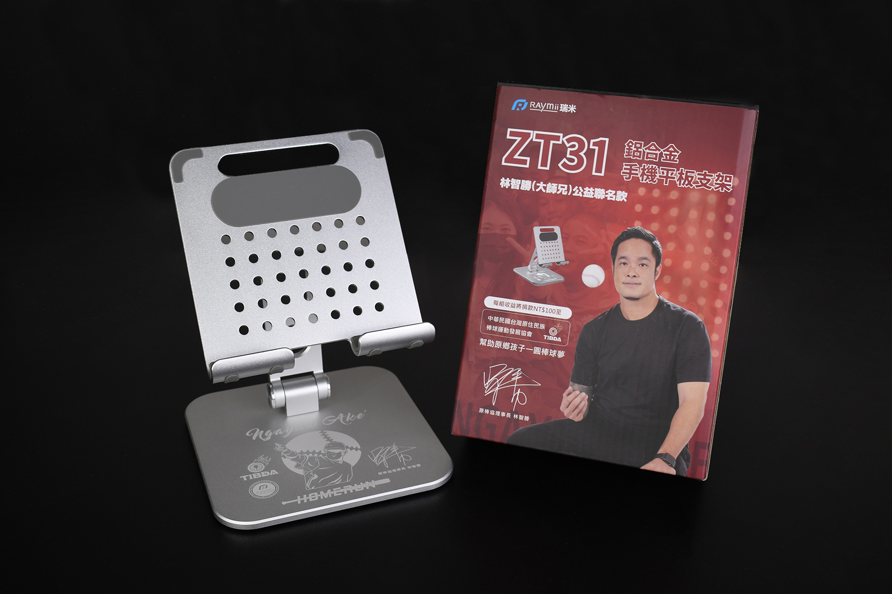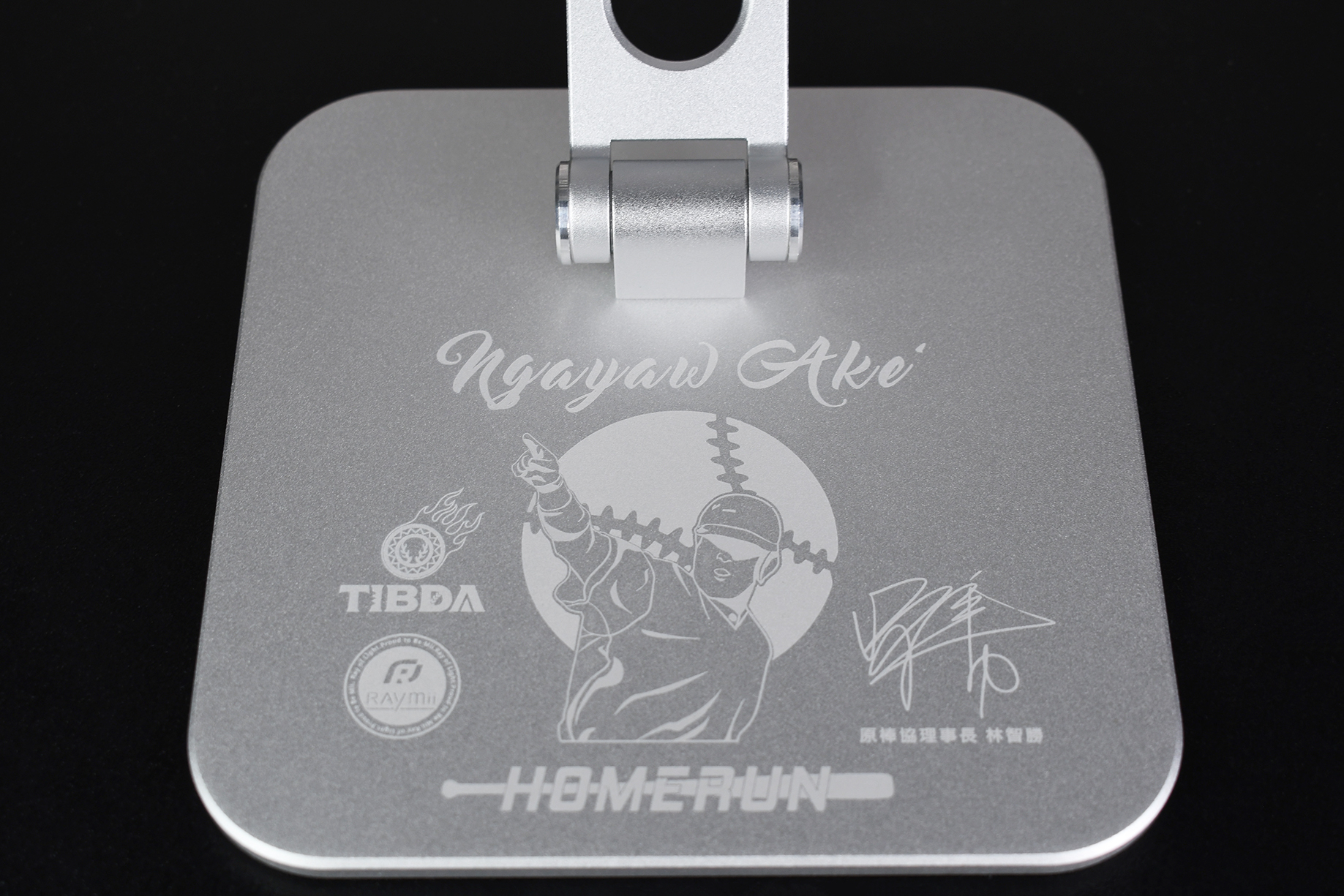 手機與平板均是現代人不可或缺的工具,利用支架能夠解放雙手,抬高視線,守護肩頸健康。此次公益紀念款由全鋁合金打造,用料扎實;金屬表面經過陽極氧化工藝處理,製作精良,永不掉色。透過高精準高功率雷射雕刻,將林智勝本人的剪影與簽名精美的呈現於底座上,搭配經典棒球元素設計,並一次推出銀色,黑色,玫瑰金三種款式,整體極具收藏價值。